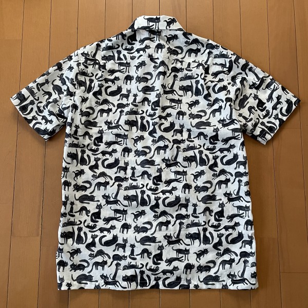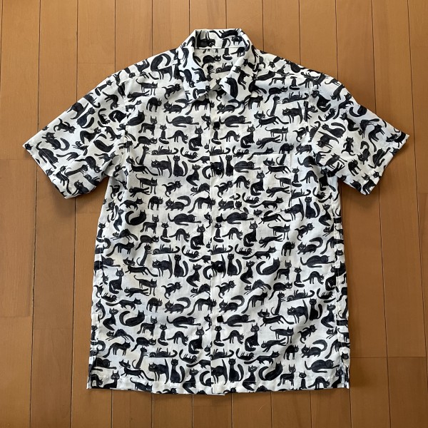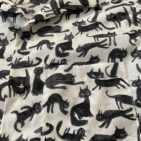 気ままな黒猫たちの柄布で、自分用のアロハシャツを作りました。メンズのSサイズで丈がやや長め。
