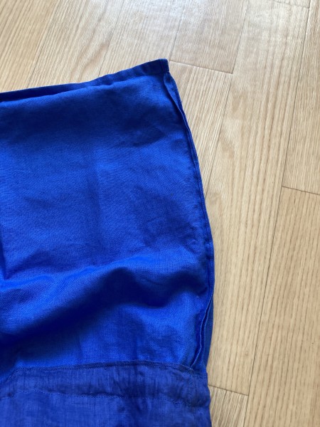 手持ちのオリエンタルブルーのリネンで巾着バッグを作りました。