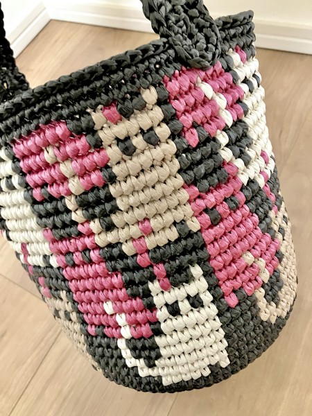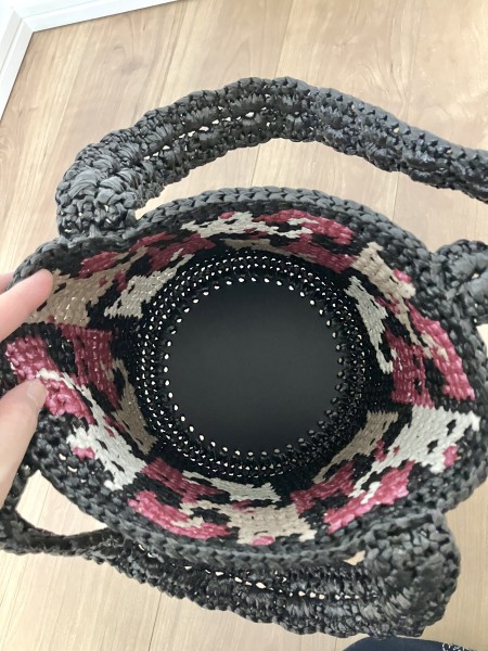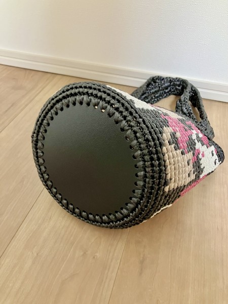 初めて底板を使ってバッグを編みました。自分で編むよりもしっかり作れるかと思ったんですが、素材がビニールなのであんまり変わらないような?