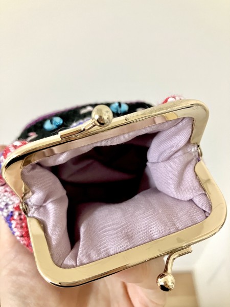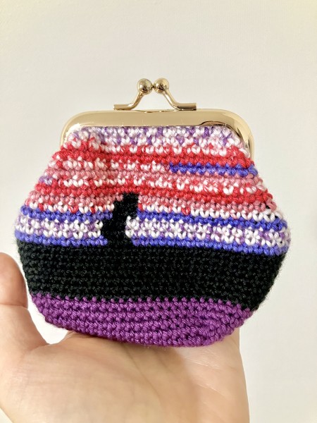 グラデーションの毛糸を使って黒猫のモチーフが入ったがま口のお財布を編みました。