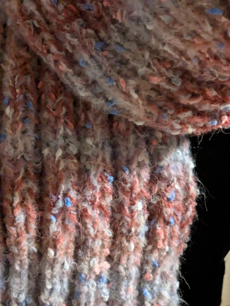 | 砂糖菓子のような、ネップが散りばめられた毛糸をみたら、マフラーが編みたくなりました ストレッチループを引き揃えると、モチモチとした感触のマフラーになりました |