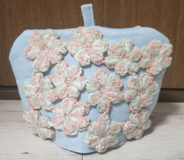 ティーコジー本体はフェルトで作り、外側の花は毛糸で編みました。
