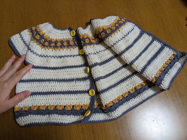 ヨークから編むかぎ針編みのベスト。ヨークから編むのは初めてだったのでこれで作りを理解しました。