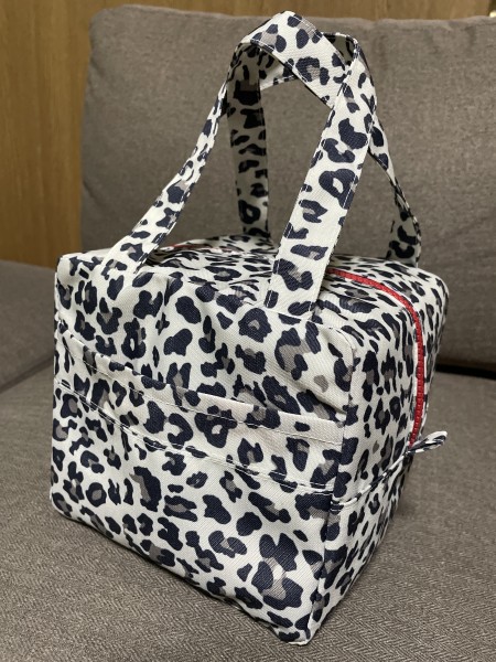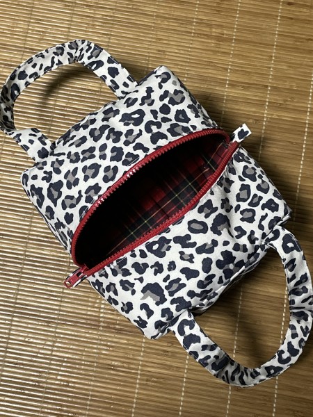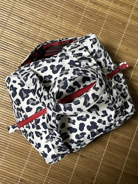 | 洋服とセットで売っていたトートバッグをほどいてリメイクしました。推しのイメージのレオパードや赤のチェックを使ってCDケースを作りました。クッション性と外気温の影響から守る為にアルミシートをはさんで縫ってあります。推しショップで買ったワッペンも縫い付けました。 車で聴くCDを入れて、もちろん聴くのはロックオン〜♪ |