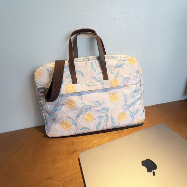 | オーダーをいただいて作ったパソコンバッグです。 自分が持っていたものを参考に、同じ大きさで作りました。 透かしホオズキをデザインした生地を表に、同じ色を使ってデザインしたストライプの生地を裏生地にしました。 デザイン: Fancy Lantern Plants (beige) / Cozy Stripes (green) コレクション: Fancy Lantern Plants |