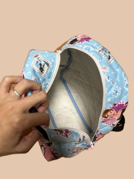 登園リュック。キルト生地です。ベルトを挟んでいるところが硬くて、バイアステープでくるむのが大変でした。