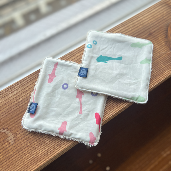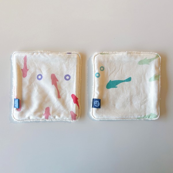| 裏面にオーガニックコットンを縫い合わせたミニタオル。 小さな魚たちが群れになって泳ぐ、シンプルなデザインです。この夏は大活躍しました。 デザイン: Aquatic Symphony コレクション: Celestial Treasures |