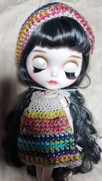 ソックスの余り糸でワンピースを編んだら、帽子もセットにしたくなりました。