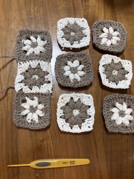 | 使用糸 | DAISO フラッフィー F1ブラウン、DAISO リサイクルコットン ホワイト |