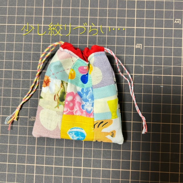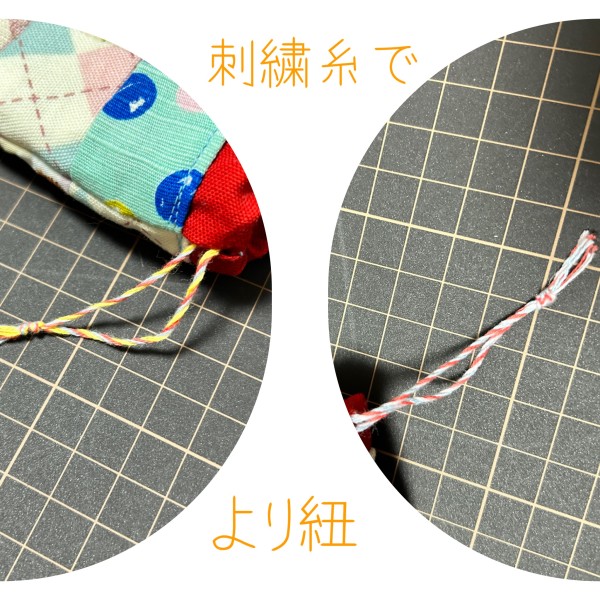 普通の紐だと絞れそうになかったから、刺繍糸を使って細い紐を自作しました。細すぎたかな?