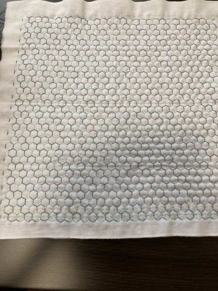 水色と青で麻の葉を刺しています。 全部刺し終えたらマスタードで花芯を刺しますが、2段フライングで刺してしまいました。