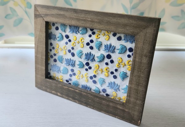 睡蓮をイメージしたイラストを、サテンステッチで刺繍しました。