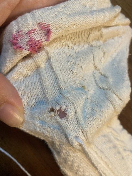 | 小学1年生の娘が、 靴下の側面に 穴を開けてきて!? 気に入っている 長靴下だからと 可愛く刺繍したかったものです。 何も参考にせず、 ただハートに縫ってみました。 完成は、意外と大きくなっちゃったし、 形も縦長になっちゃったけど 娘は「可愛い」と喜んでくれました。 刺繍もっと勉強したいな |