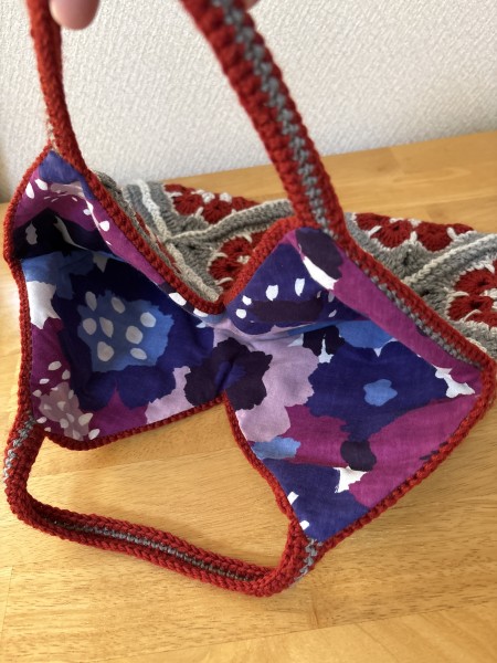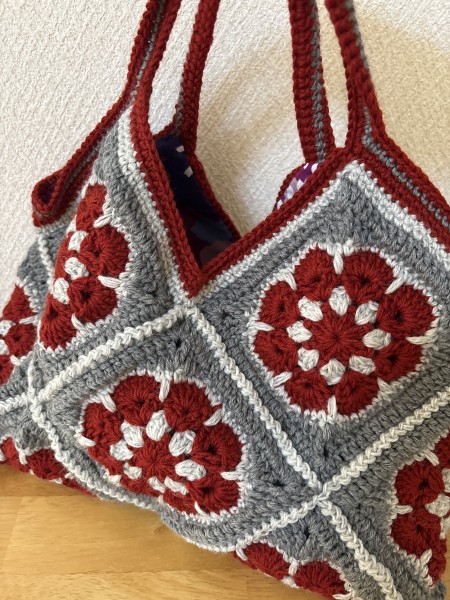 細めのウール糸を2本どりでアフリカンフラワーモチーフを10枚編んで糸が終わったので、10枚つなげて、手提げバックにしました。