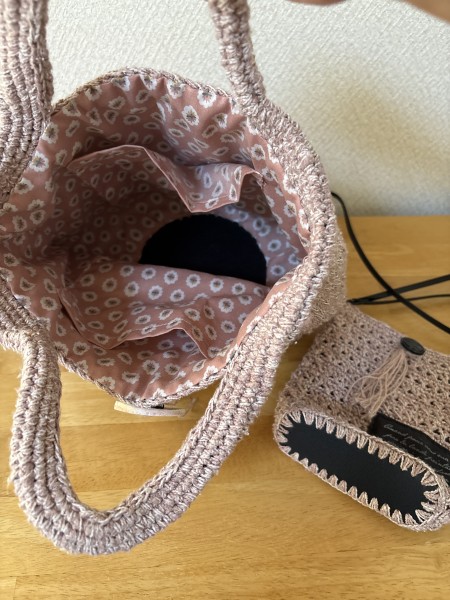 | コットンのかせ糸を2本どりで、円形と小さな長方形のバック底板を使用して、トートバックとスマホショルダーバックを編みました。 | |