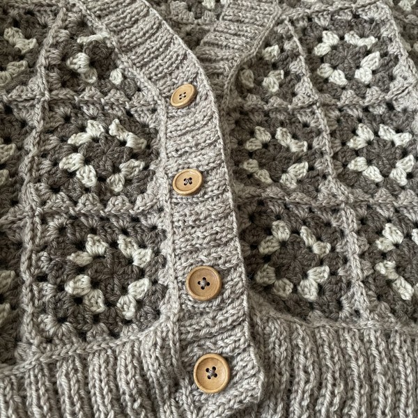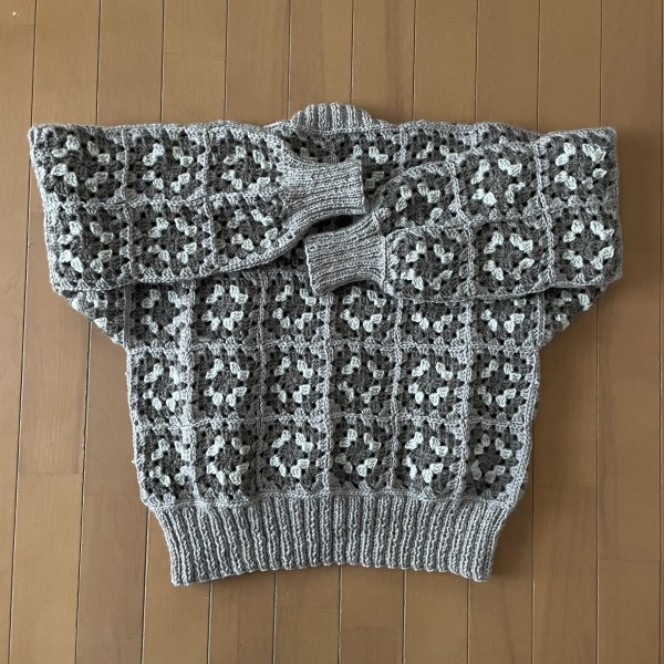 | モチーフを繋げたカーディガンを編みました。長い道のりでした…。 地道にモチーフを編み、繋ぎながら大きなパーツを作り、さらにそれを繋げてから、棒針で裾・襟・袖口を編みました。 棒針は裾と襟に4号輪針60㎝、袖口は4号4本針を使用しました。二目ゴム編みです。 |