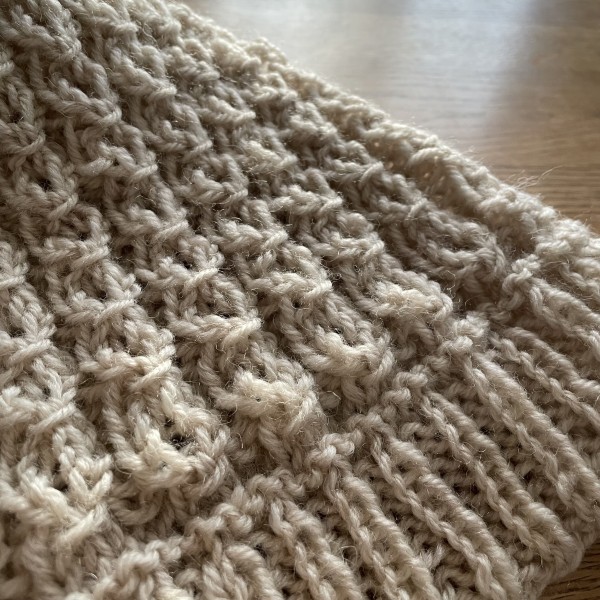 本では13号棒針指定でしたが、12号しか持っていなかったので12号で…。5目で一模様だったため、作り目を10増やして編んでみました。