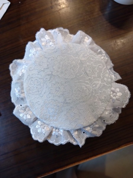 ティーカップ型ピンクッションを作りました。アクセントに蝶々を留まらせました♪