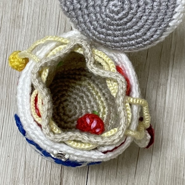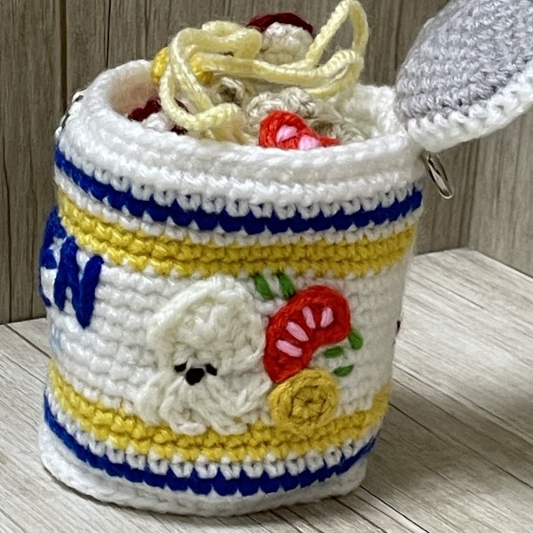 カップラーメン巾着のシーフードです。具は、イカ、エビ、卵、ネギです。側面と蓋を可愛くしてみました。