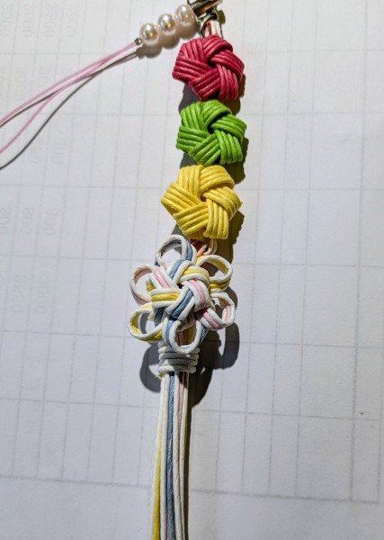 余ったクラフトバンドで、バッグチャームを作りカラフルな花結びを加えました。