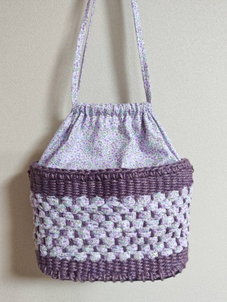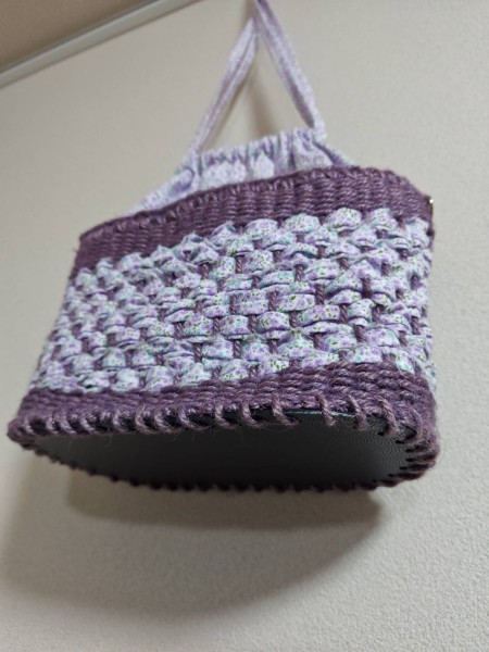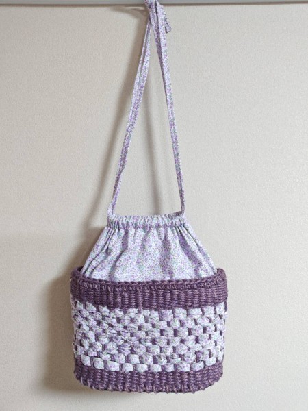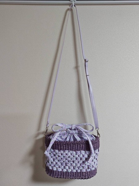麻ひもの輪織レッスンで、裂き布巾着バッグを作りました。