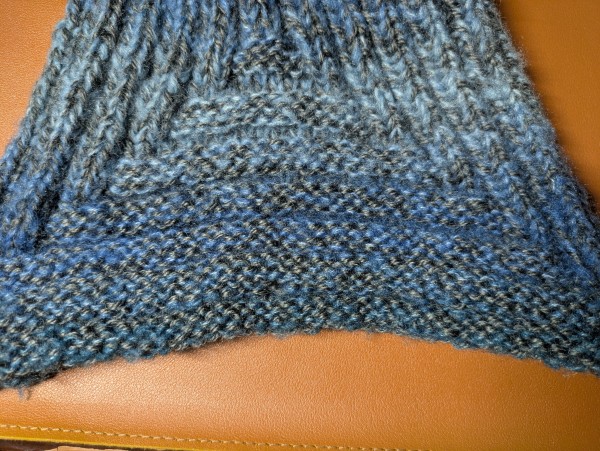ゴム編みが縮むのを利用した模様で、ぐるぐる編んでいくと、