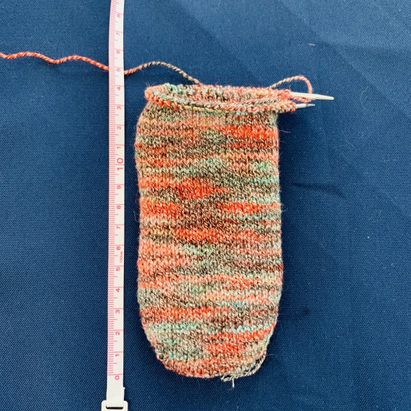 甲側は二目ゴム編み、裏側は表目で、つま先から17cm編む。