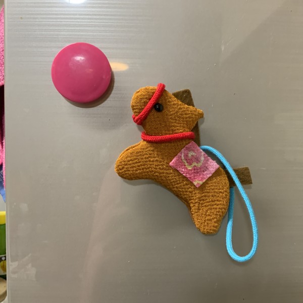 | 厚紙に縮緬を貼り付けて、ストラップにしました。 視覚障害の方のリクエストを受けて、講習で作ってもらうために考えた作品です。 (実際作ってもらうときは、厚紙や布はあらかじめカットしたり、かなりお手伝いをしたキットになります) 布の裏側にはキルト芯をはさんています。 ストラップにしたときにバランスがとれるよう、中に磁石を入れたので、マグネットとしても使えます。 |