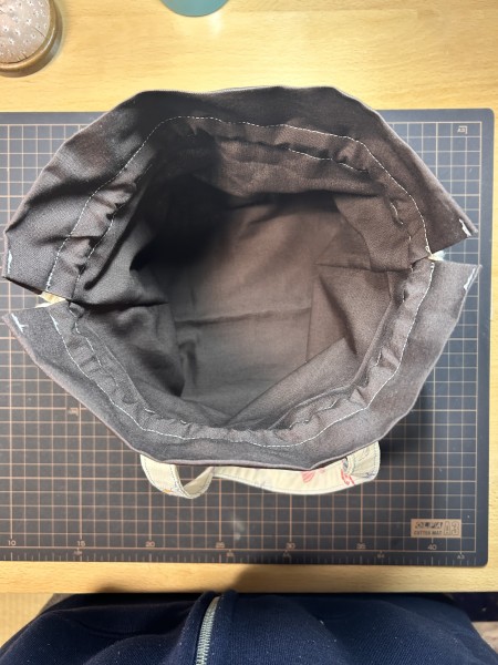 小さな巾着バッグ。持ち手長め。マチ大きめ。ちょっとした買い物にいいかも。
