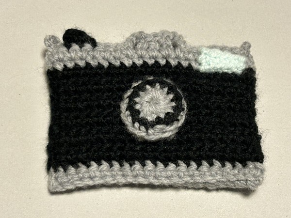 旦那さんの趣味のカメラを編んでみました。目数などのサイズは自分なりに考えて、バランスを見ながら作りました。完成するか不安でしたが、一応カメラに見える作品になったので、満足しています。