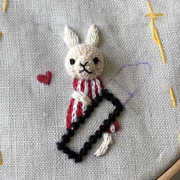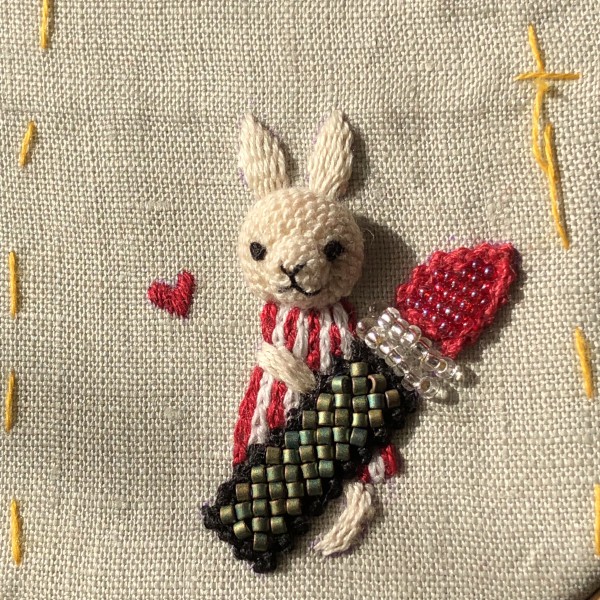 うさぎの立体刺繍をしてリップを入れるケースを作りました カバンにぶら下げて使えます  裏面も花を刺繍