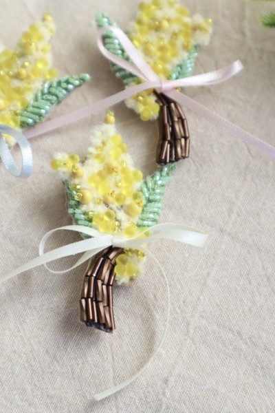 毛糸でフレンチノットしたことでミモザのふわふわ感を表現しました。 茎の部分も太めにしたことで、ブローチとしてしっかり身につけて頂けます