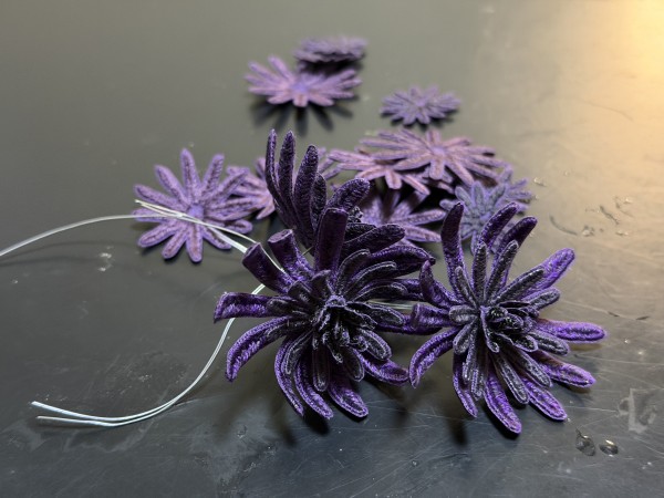 オーダーいただいた髪飾りを立体刺繍で作ってます。