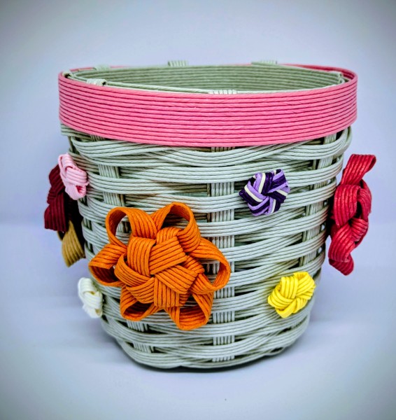 クラフトバンドでペン立てを作り、花結びカラーでにぎやかに飾りました。