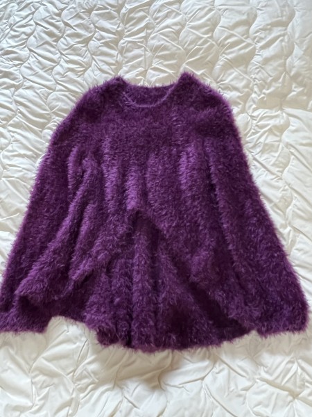 | 襟のカーブが気に入らず2度編み直しましたが、ふんわり軽くドレープもいい感じに仕上がり満足しています 一目ゴム編止めだと毛足が引っかかり綺麗に揃わなかったので鎖止にしました 前カーブの始まりがお腹の半ばなのがやや不満ですが完全に隠せる丈にすると後ろ丈が長くなり過ぎてスカートやパンツとのバランスが悪くなりそうで妥協しました 実際着ると平置きよりも大きなドレープが3.4本出る程度です |