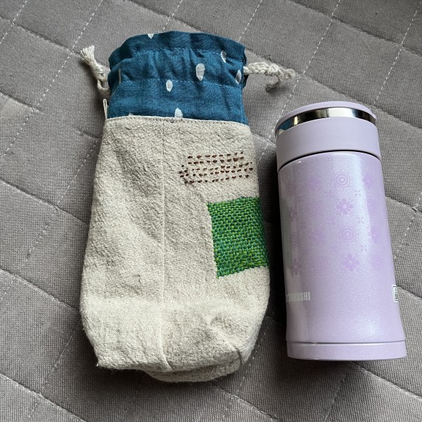 新しい小さいマグボトルを買ったので巾着袋作りました。ダーニング刺繍の練習した布があったので表地に使ってみたら、いい感じに出来たので、使うのが楽しみ。