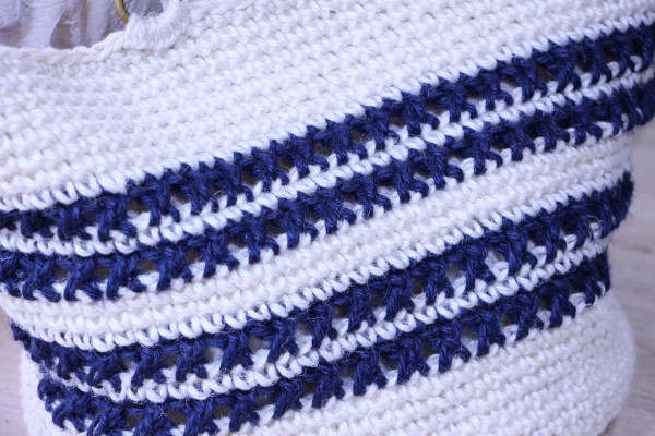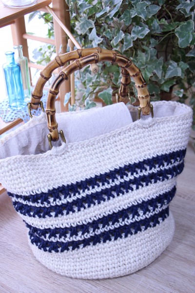 | 長編み交差の模様入りバッグが完成しました~(^O^) 紺色の交差模様を生かせるよう、 内布はあえてベーシックな生成色をチョイスしました。 内かぶせを付けて、中身が見えないようにしています。  |