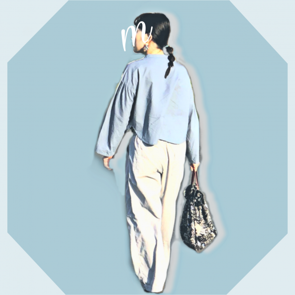 お気に入りパターンのショート丈シャツシリーズ。身頃の丈感が長すぎず、短すぎず、ちょうど良くできて満足。裾は丸くカット。