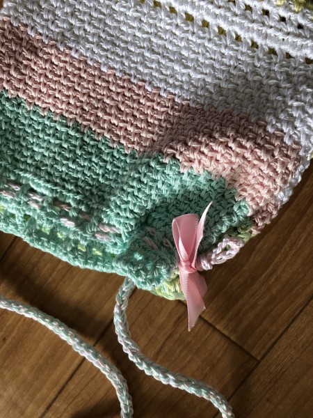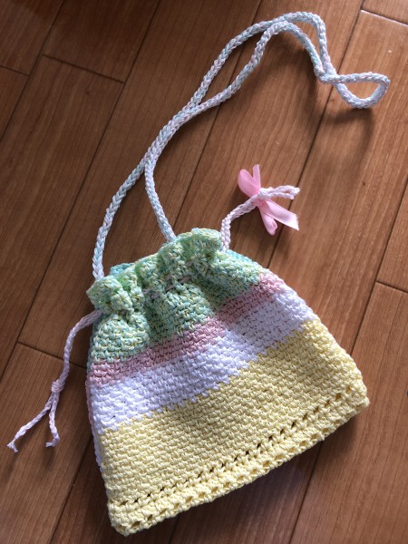 巾着を見た孫が、欲しいと言うので、孫の背に合わせて肩紐もつけました。
