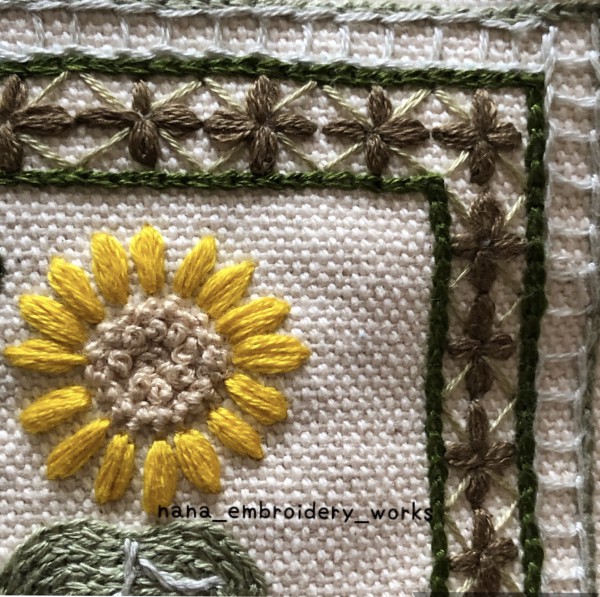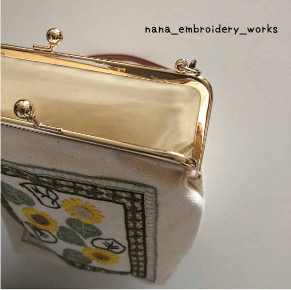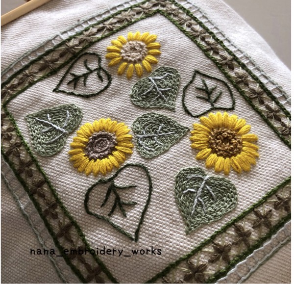 | ひまわりの刺繍を8号帆布に。8号は厚地で刺繍に向いていませんね。。。(指抜きをつけて刺繍しました) ですが さすが小物に仕立てても帆布はしっかり度が↑格段に上です。 | |