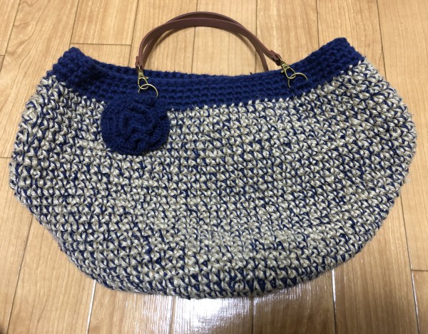 100均の麻紐は、硬くて編みづらいのですが、毛糸を合わせると編みやすくなりました。寂しいので、コサージュを編んでつけました。