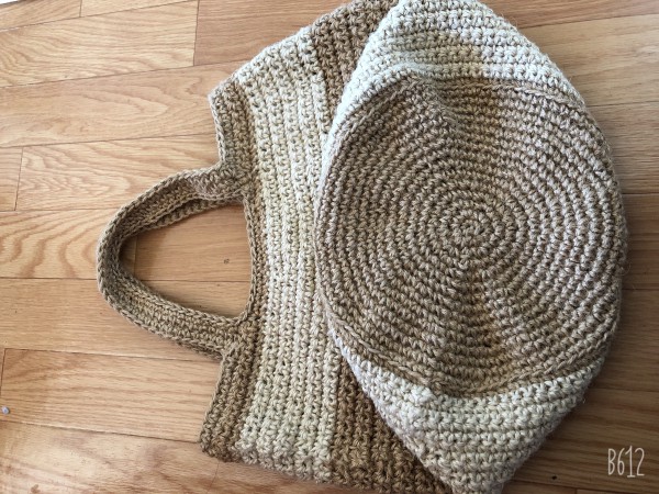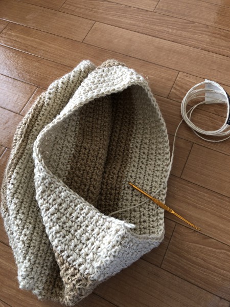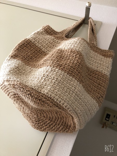 少しずつ残っていた麻紐を使い、大きめのバッグを編んでいます。