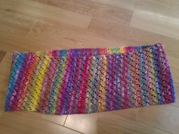 模様は編みながら作ったオリジナル。ほんの少ーしですが、全体が斜めに傾くレース模様です。