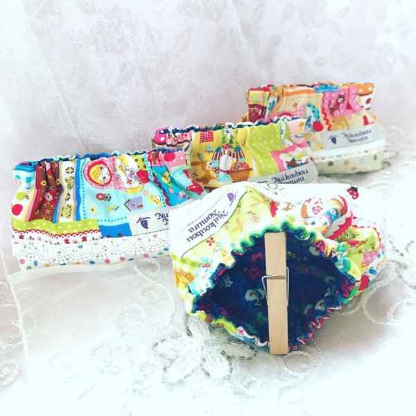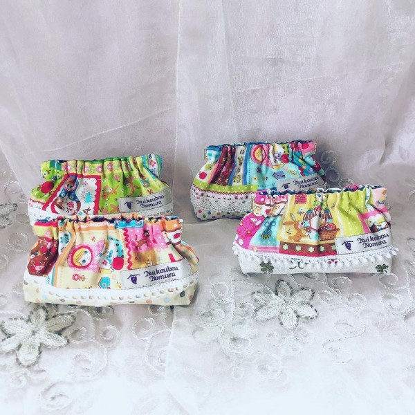 マトリョーシカプリントお色違い4色と、切り替え布、レースの組み合わせを楽しんで製作した、12㎝ばね口ポーチです。