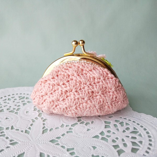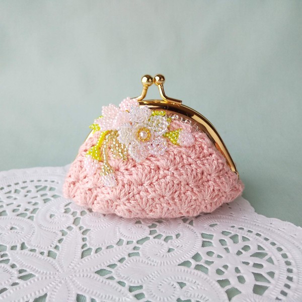 | 底は細編み、側面は扇を広げたような編み地の松編みです。コットンなのでサラサラです。 コットンだけでは寂しかったので、ビーズステッチで作った桜をアレンジしてみました。 ビーズを一粒一粒針に通して、適度な力加減で引き締めながら、桜の中心から作っています。 バッグの中で迷子になりがちな小物を入れたり、 アクセサリーを入れたりすることができる、がま口ポーチです。 手のりサイズなので使いやすい大きさです。 |