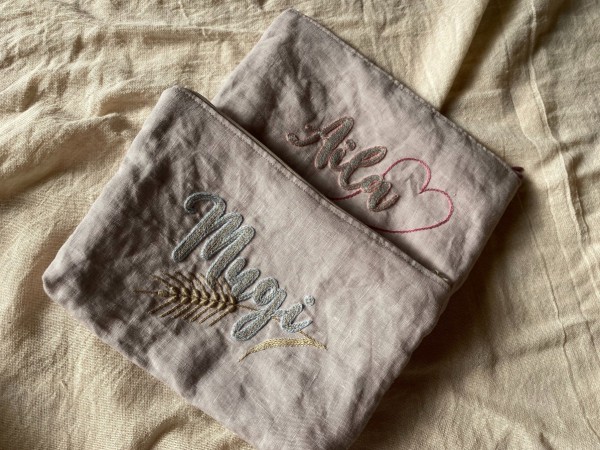 出産祝いでお名前刺繍のポーチを作りました。A5サイズで兄弟お揃い感のあるもの。マスクやおやつを入れるんだそうです。