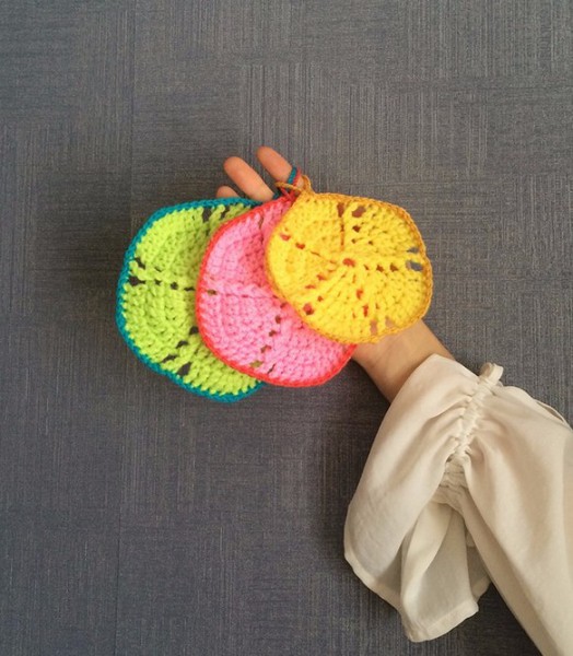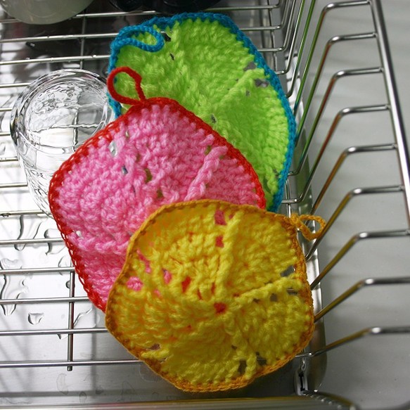 キッチンが楽しくなるエコたわしを作ってみました。薄手にしたのですぐ乾いて使いやすいものになりました。