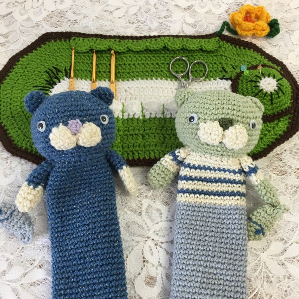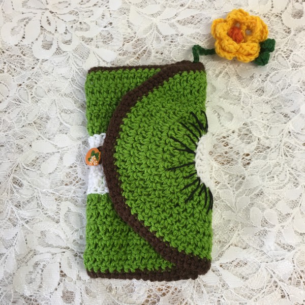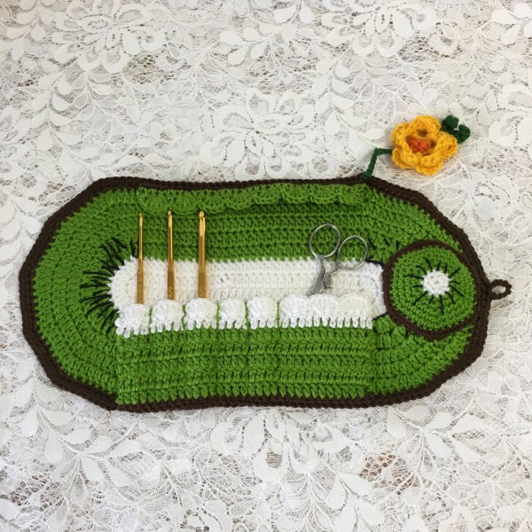かぎ針ケースいろいろです。布のはかなり前で回りの縁飾りがかぎ針で、くまはEテレを参考に!キイウイのはインスタを参考にしてます。どれも持ち運びには???