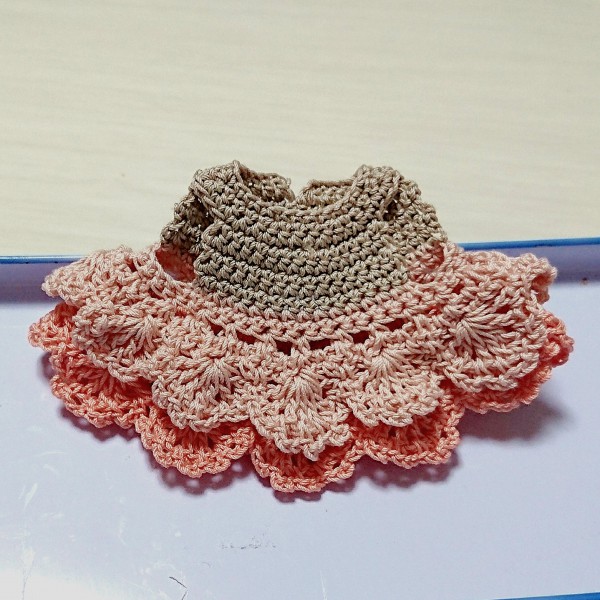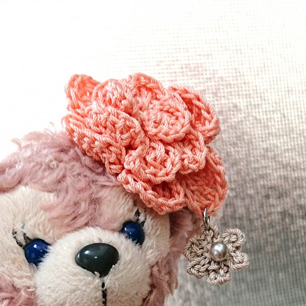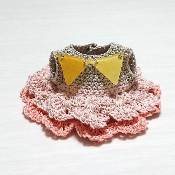 | シェリーメイ(ぬいぐるみバッジ)のワンピースです。 裾のスカラップでキュートな雰囲気に。 小花とリボン代わりのプラ板を飾りました。 |