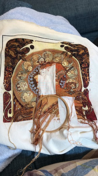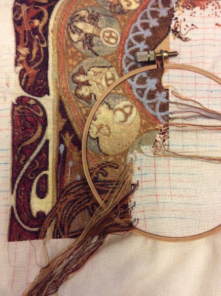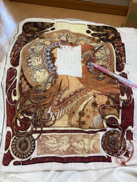 私もFBで全面刺しというのを知り、大好きなミュシャの図案を見つけて、久しぶりにクロスステッチをすることにしました。